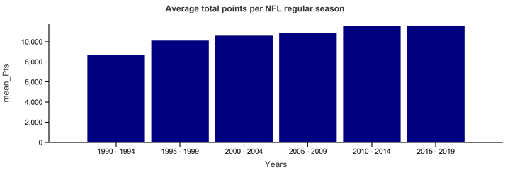 - Models may use historical data that's too old. Points and touchdowns have been on an upward trend for the past 30 years, at least. The plots below, based on data gathered at pro-football-reference.com show both points and receiving touchdowns steadily marching upwards (we focus on Receiving TDs because of the emphasis on passing when a team is behind). Binning the years into groups of 5 removes anomalies, clarifying the upwards trend. Because NFL data is sparse, as discussed earlier, it may be tempting to use 10 or 20 years of data in order to solidify the data set. But as the binned graphs show, looking backwards more than just a few years is likely to include data that doesn't reflect the current state of QB talent, offensive aggressiveness, and the ability to quickly pick up large chunks of yards when needed. This is even more noticable when we repeat the analysis, focusing purely on passing efficiency statistics -- adjusted yards per attempts and passer rating.