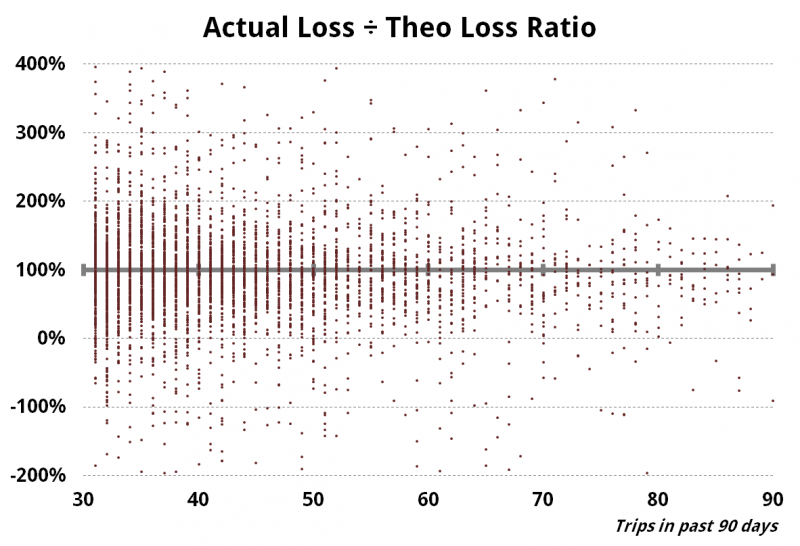 Each dot represents one player. Placement on the x-axis is determined by their number of visits in 90 days. The y-axis represents their ratio of Theo / Actual. 1.00 or 100% indicates that player’s Theo and Actual were identical. 200% means the player actually lost 2x his or her theo, and so on. A ratio below zero means the player was a winner. What is so surprising is how wide the distribution is — if Theo and Actual really converged as expected, nearly all the dots would be in a tight region right around 100%. And keep in mind the minimum number of trips in this data set is 30 (over 90 days), so it only covers highly-frequent guests. 95%+ of your customers visit less often, and are therefore even more likely to have a huge gap between their Theo and Actuals.
